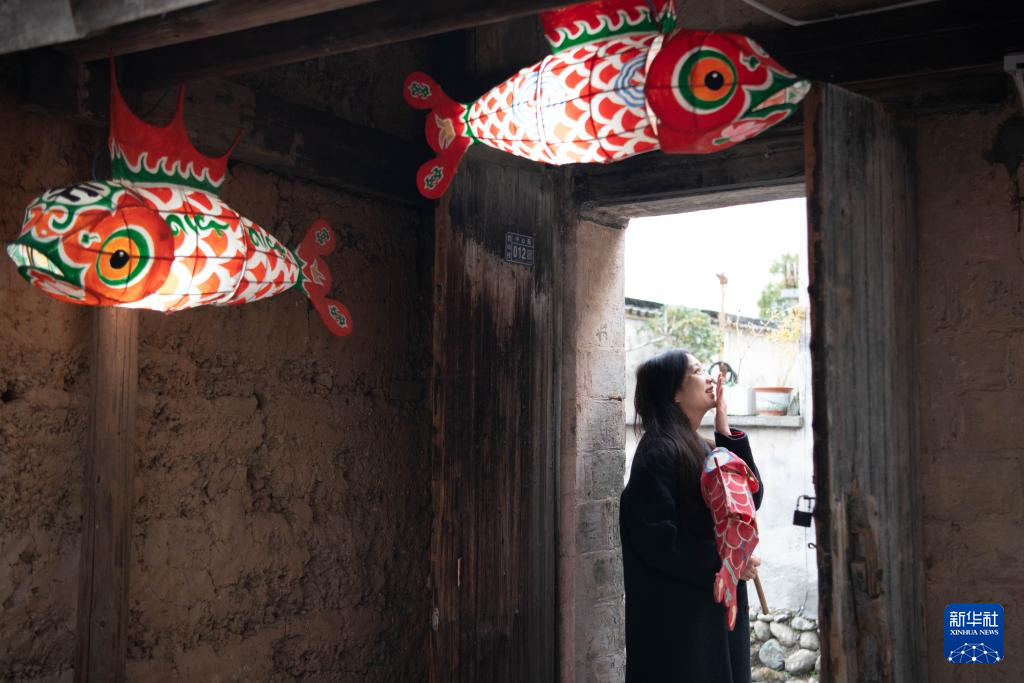 2月7日,在安徽省黄山市黟县碧山村,手艺人在制作鱼灯。
