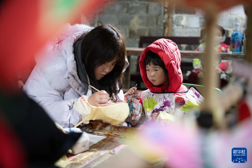 2月7日,在安徽省黄山市黟县碧山村,小朋友和家长体验鱼灯制作。