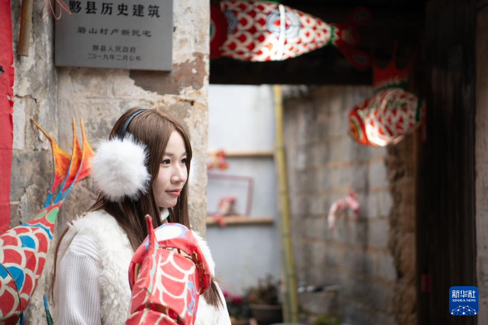 2月7日,在安徽省黄山市黟县碧山村,游客在当地民居门前手持鱼灯留影。