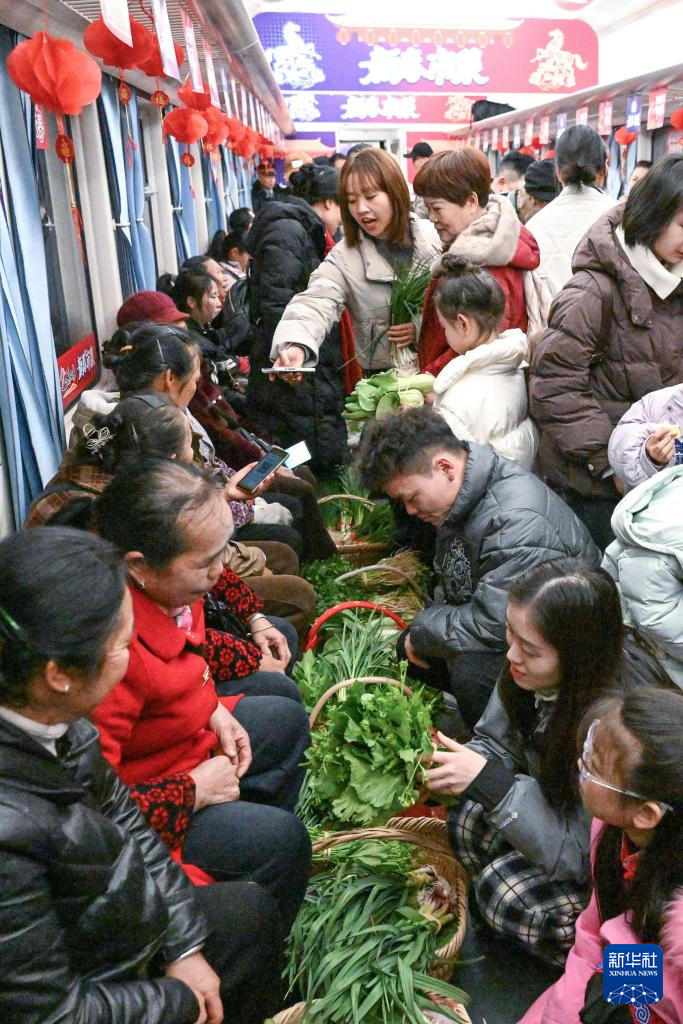 2月8日,村民在5640次“慢火车”上售卖自家种植的蔬菜。