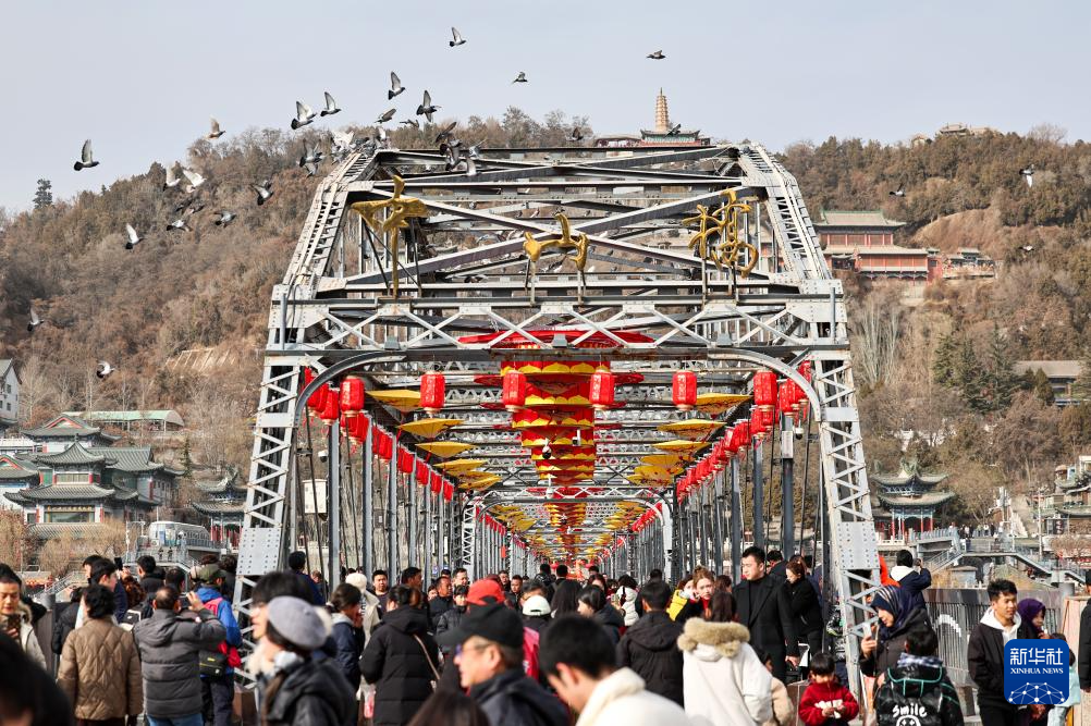 2月9日,人们在兰州市城关区中山桥上游览。