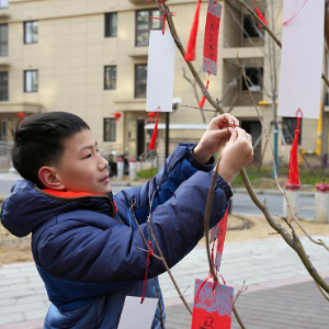 2月11日,彭一小区的小居民将新年愿望与祝福挂在“心愿树”上。