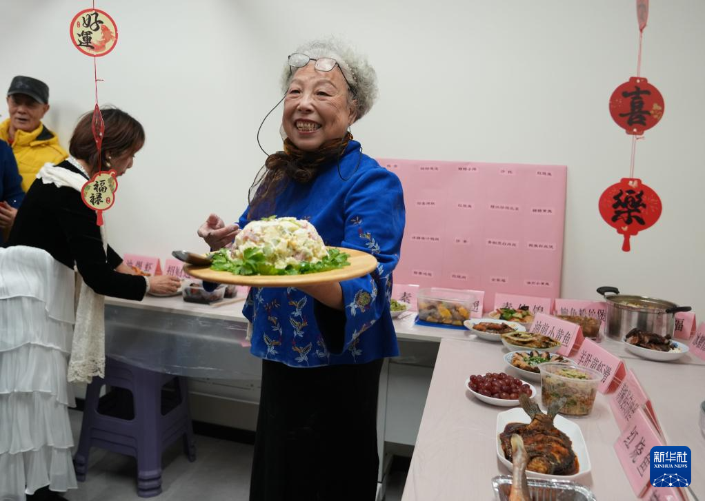 2月11日,彭一小区的居民展示拿手菜,年过七旬的彭阿姨端出自己做的沙拉。