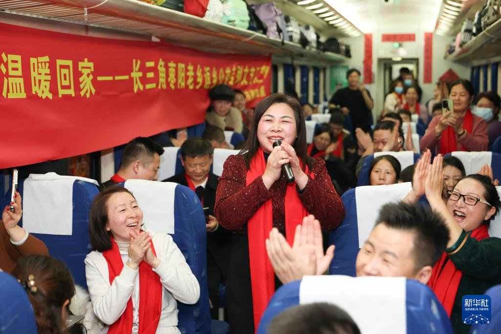 2月11日,枣阳籍务工人员在K1127次列车上自编自演节目。