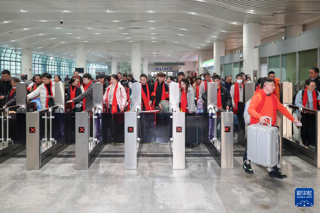 2月11日,枣阳籍务工团体在上海站优先检票进站。