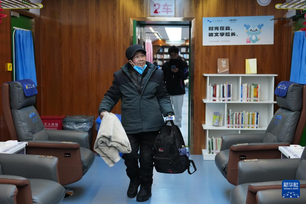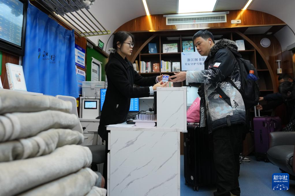 2月10日,工作人员在“星辰守护”旅客夜间休息区为旅客办理登记,旅客按需可以领取毛毯。