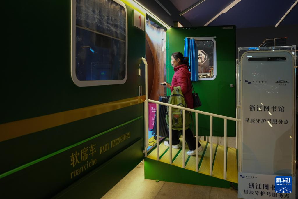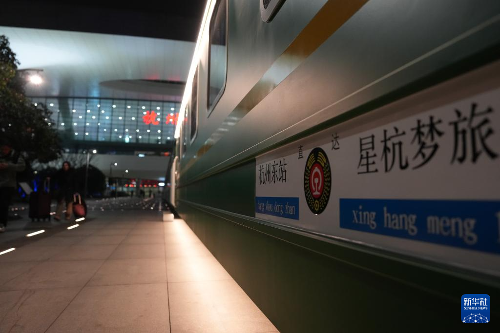 夜幕下的杭州东站东广场,四节复古绿皮车厢亮起暖黄色灯光,成为迎候夜间出行旅客落脚休息的一片“暖心港湾”。