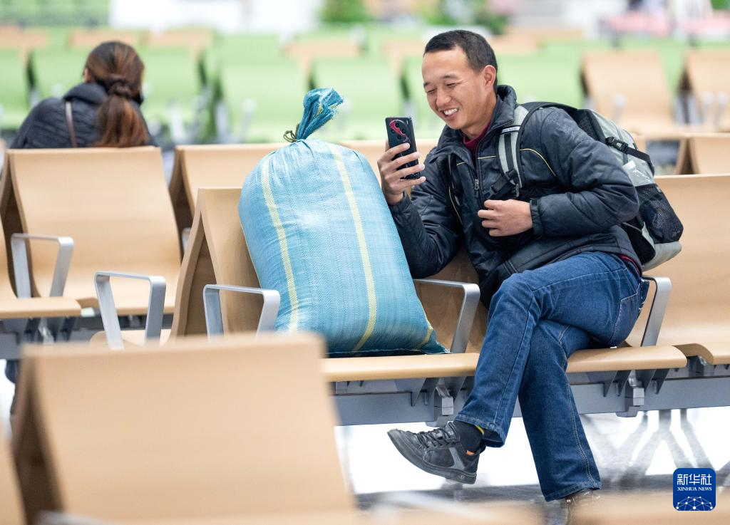 2月2日,旅客在兰州火车站候车厅拍照留念。