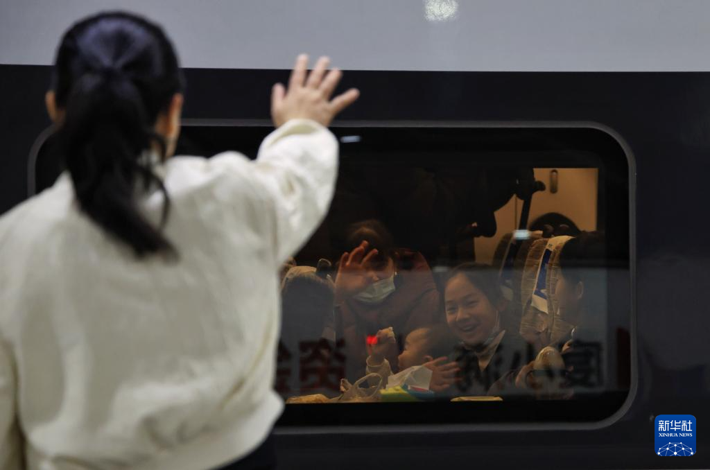 2月2日,在深圳北站,旅客与送站的亲人挥手道别。