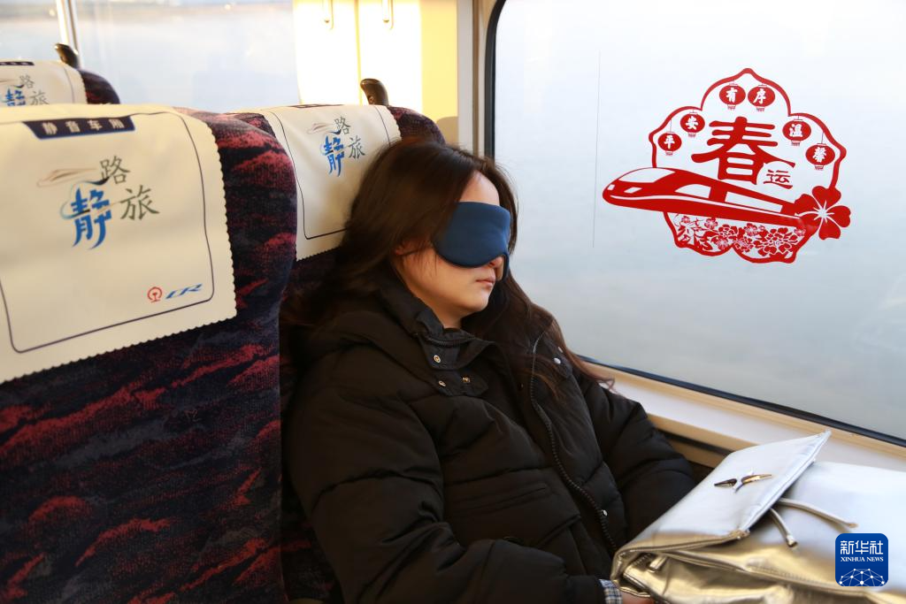 2月6日,旅客在D8696次列车静音车厢内休息。