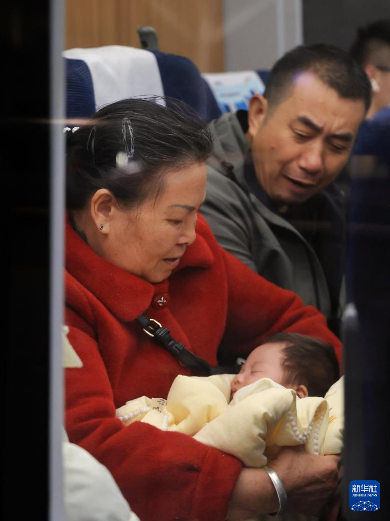 2月2日,搭乘2026年深圳地区春运首班车C7152次深圳北到岳阳东列车的乘客在车上照顾婴儿。