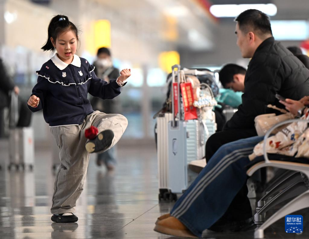 2月2日,小朋友在郑州东站候车时踢沙包。