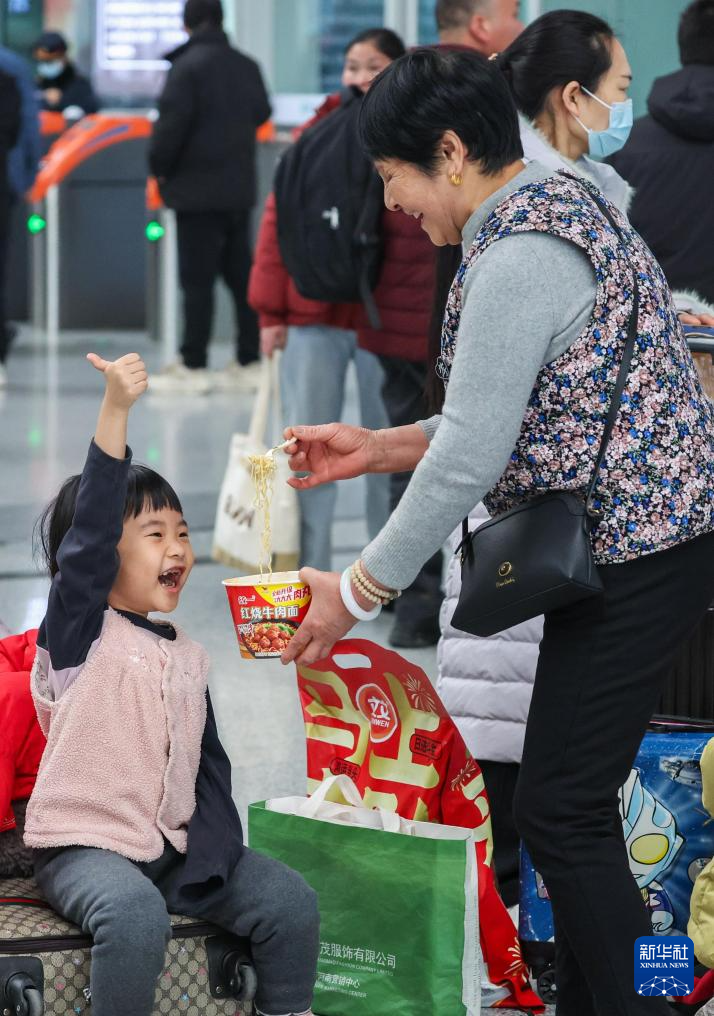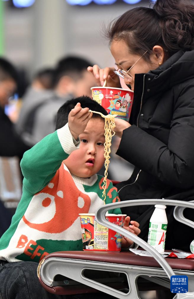 2月2日,小朋友在郑州东站候车时吃泡面。