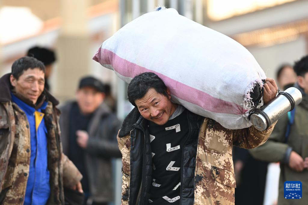 2月2日,在山东滕州站,旅客扛着行李出站。