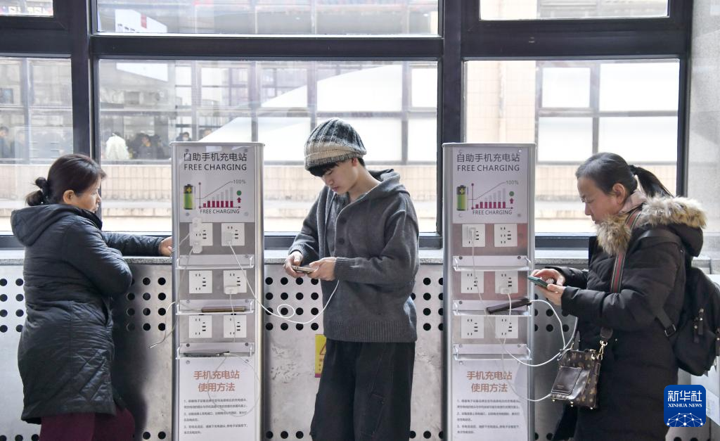 2月12日,旅客在北京西站候车大厅内的免费充电服务区给手机充电。