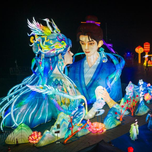 2月11日,游客在江西省新余市仙女湖新春灯会上赏玩留影。