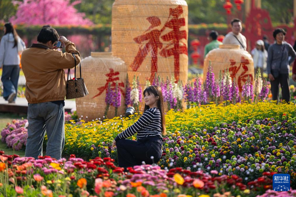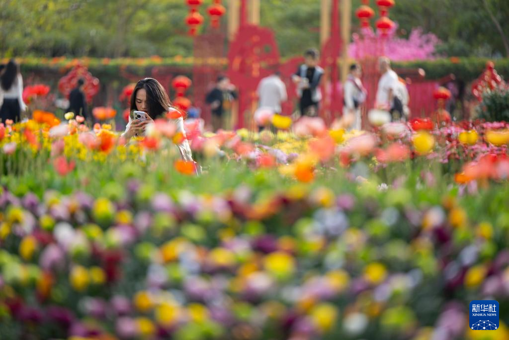 2月12日,市民在新春主题花展上参观拍照。