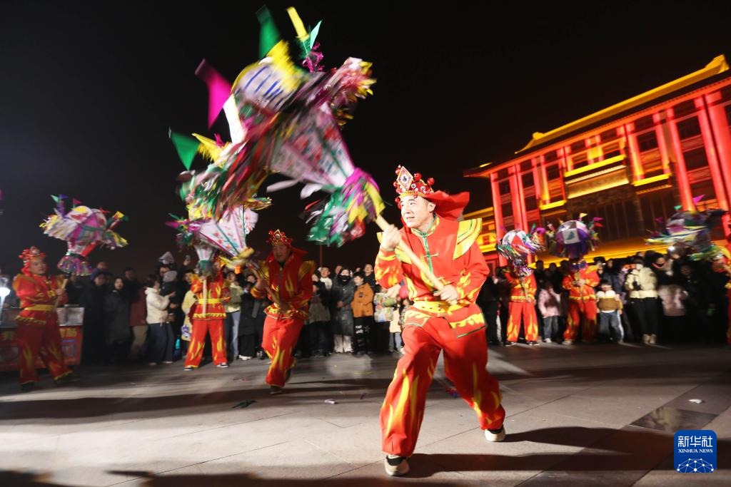 2月12日,社火队员在甘肃省定西市陇西县一处广场表演。