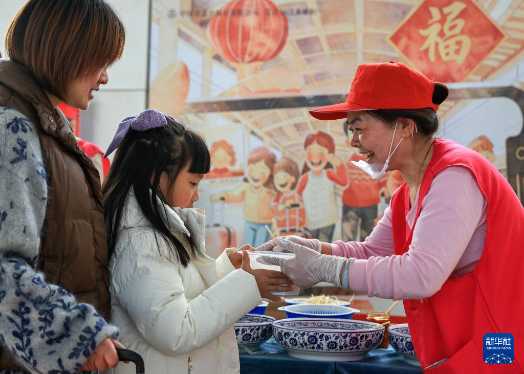 2月13日,在江苏镇江站,爱心面馆工作人员为旅客送锅盖面。