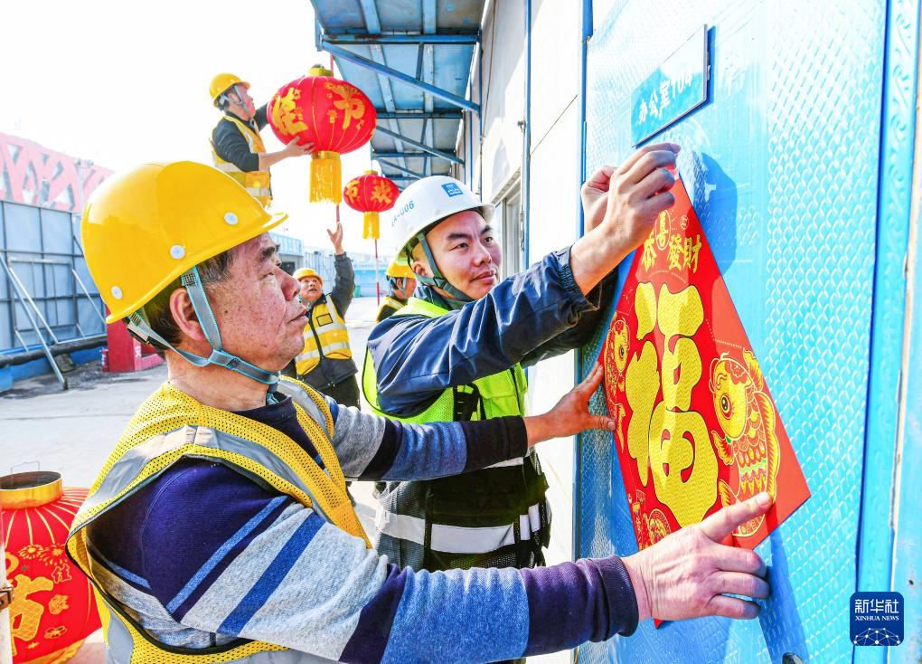 2月13日,在山东省胶州市上合示范区宋城演艺建设项目工地,中建八局四公司的工人们在生活区贴福字。