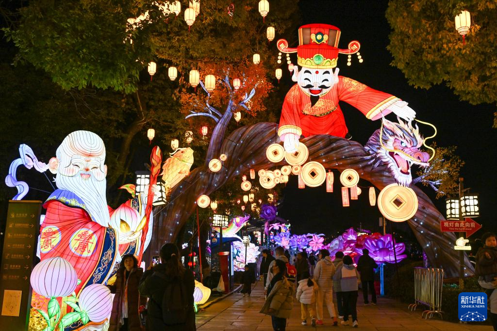 2月12日,游客在江苏南京白鹭洲公园内观赏新春花灯。