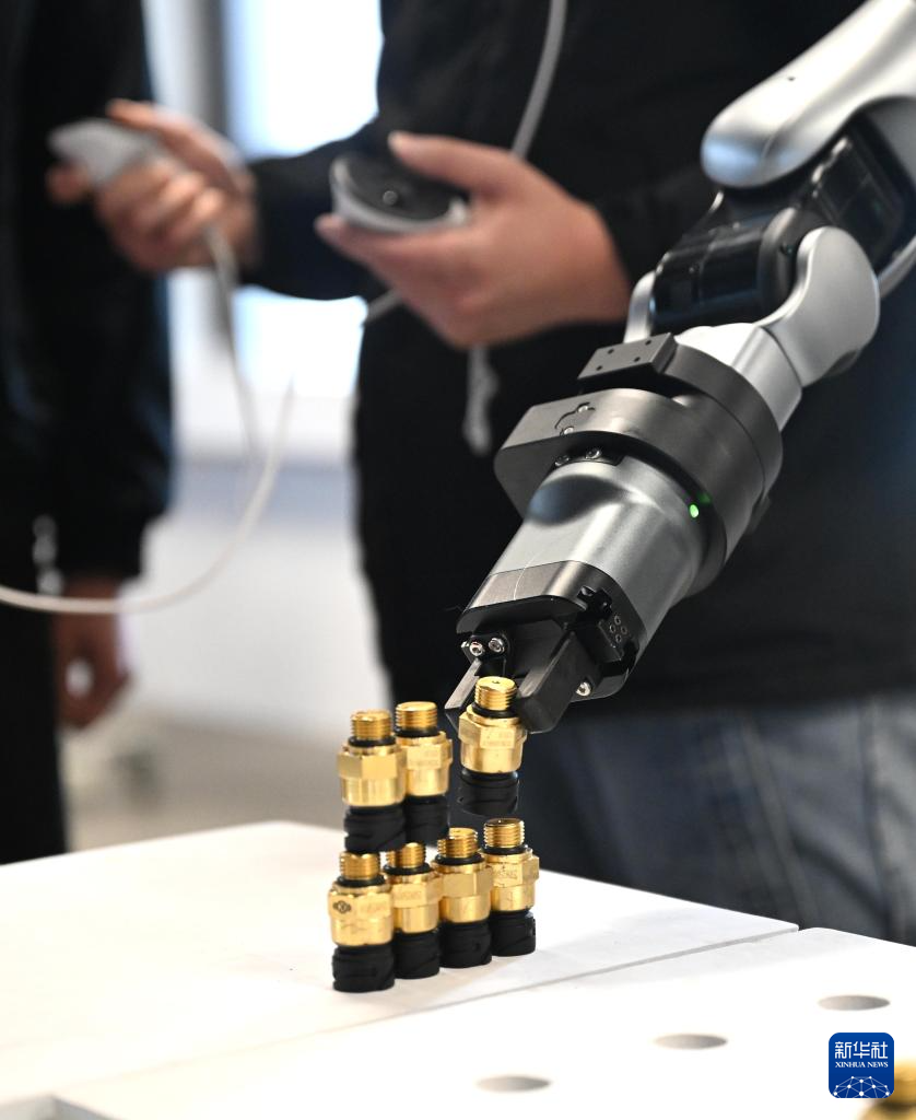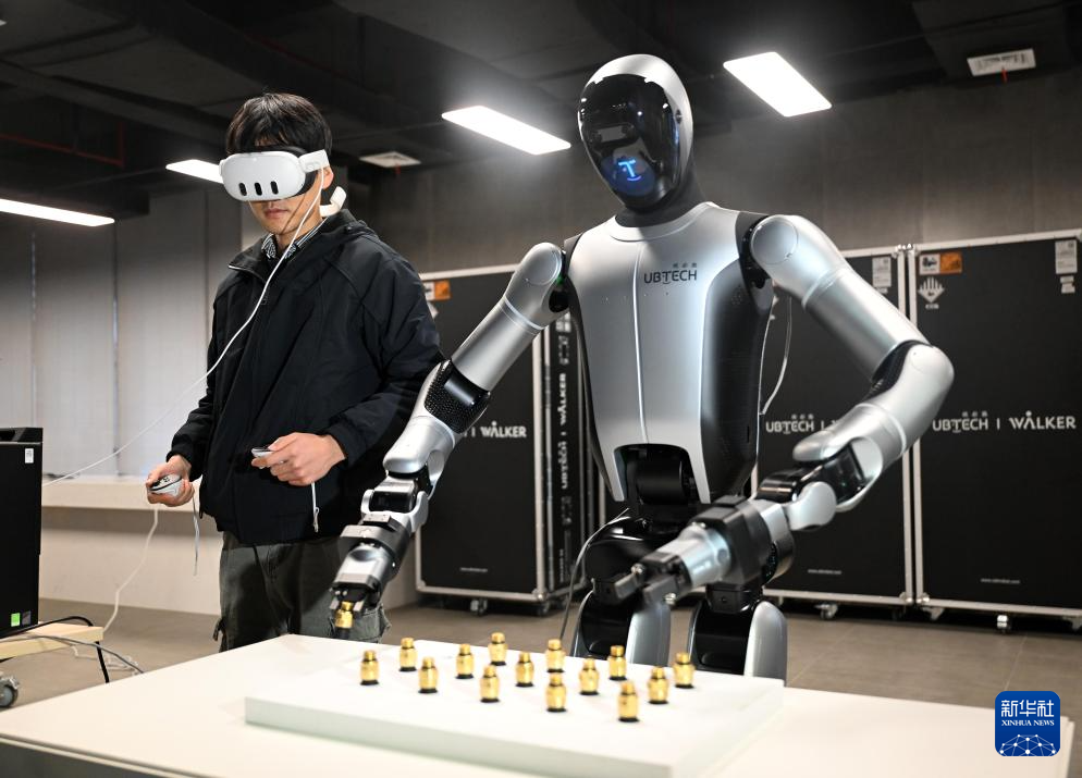 在广西柳州机器人产业园里,吴东波使用手柄与工业人形机器人进行拧螺丝练习(1月30日摄)。