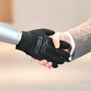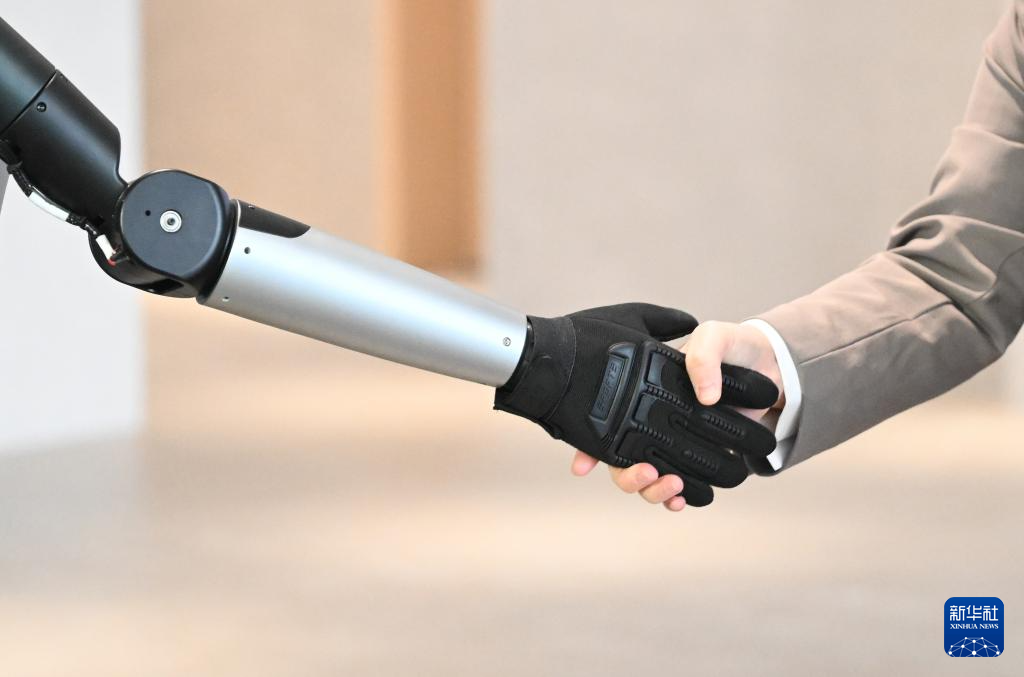 在广西柳州机器人产业园里,经过训练的工业人形机器人与来访嘉宾握手(1月30日摄)。