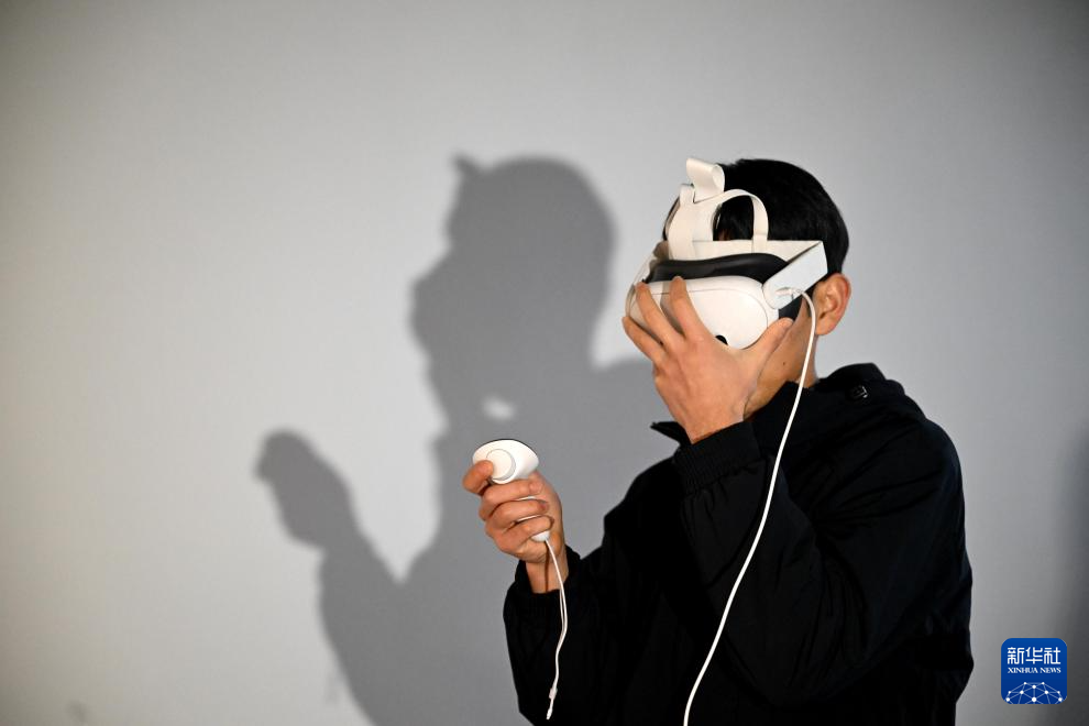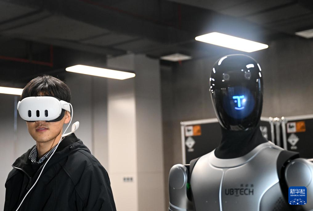 在广西柳州机器人产业园里,吴东波戴上AR眼镜与工业人形机器人进行作业练习(1月30日摄)。