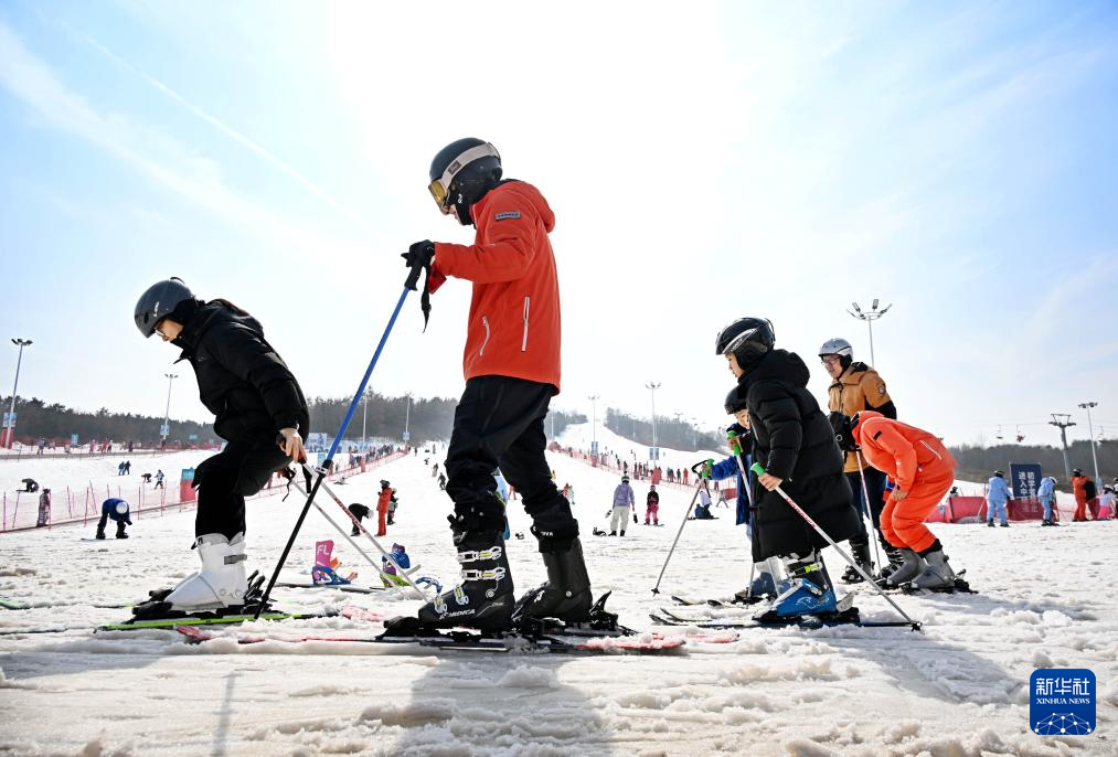 2月13日,游客在青岛西海岸新区融创藏马山滑雪场学习滑雪。