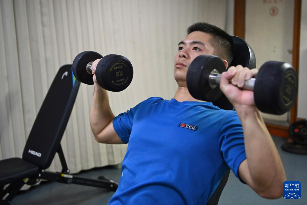 2月11日,中国海警万山舰执法员王弘在休息时间锻炼身体。