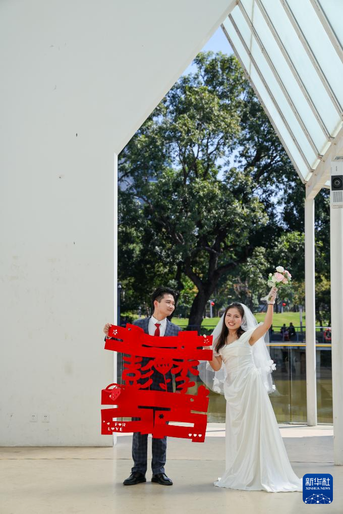 2月14日,在位于深圳市福田区香蜜公园内的婚姻登记处,新人在西式颁证厅拍照留念。