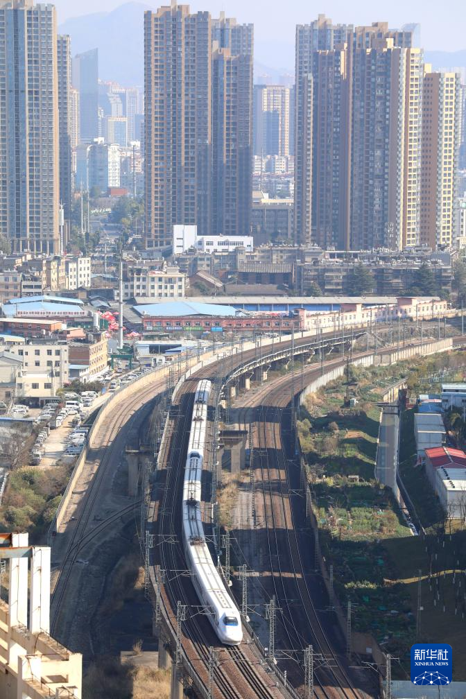 2月15日,动车组列车行驶在云南昆明城区。
