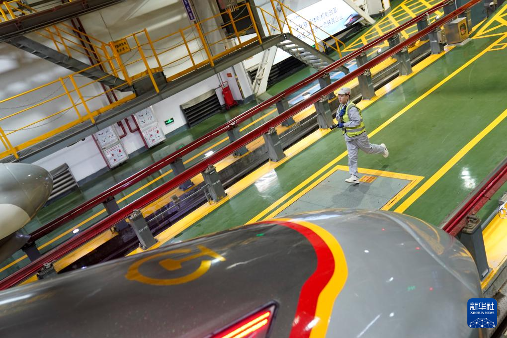 在太原动车组运用所检修库,鄂明一路小跑,赶往下一个故障点(2月13日摄)。