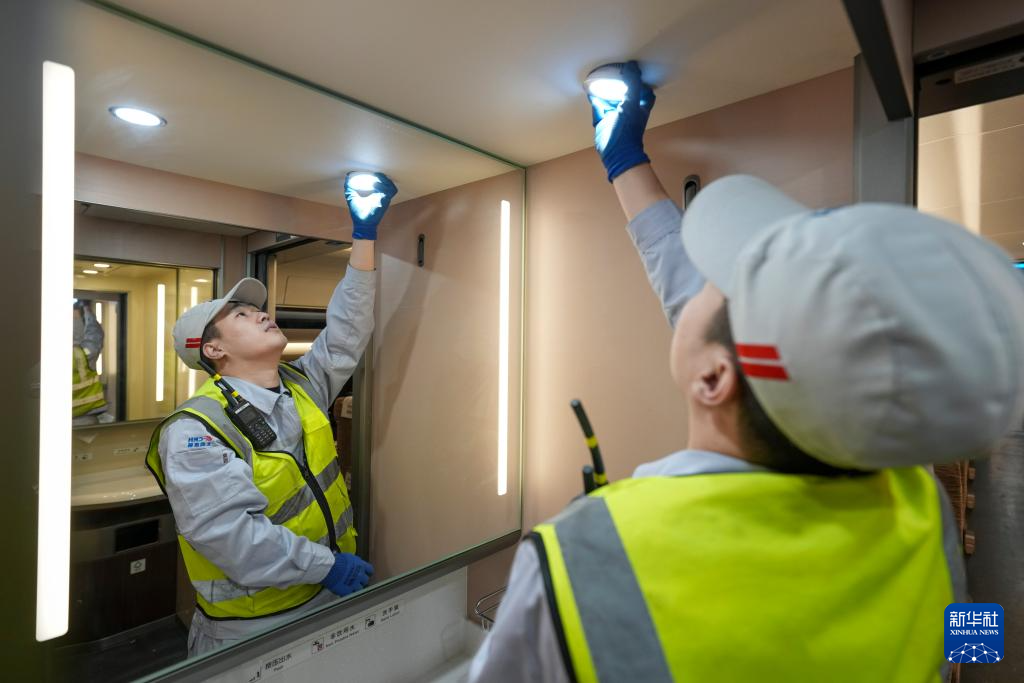在太原动车组运用所存车场,鄂明在车厢内更换照明设备(2月14日摄)。