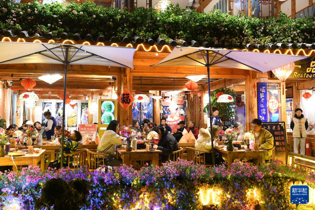 春节将至,云南丽江古城灯火璀璨,年味十足。游人络绎不绝,夜间消费市场一派热闹景象。