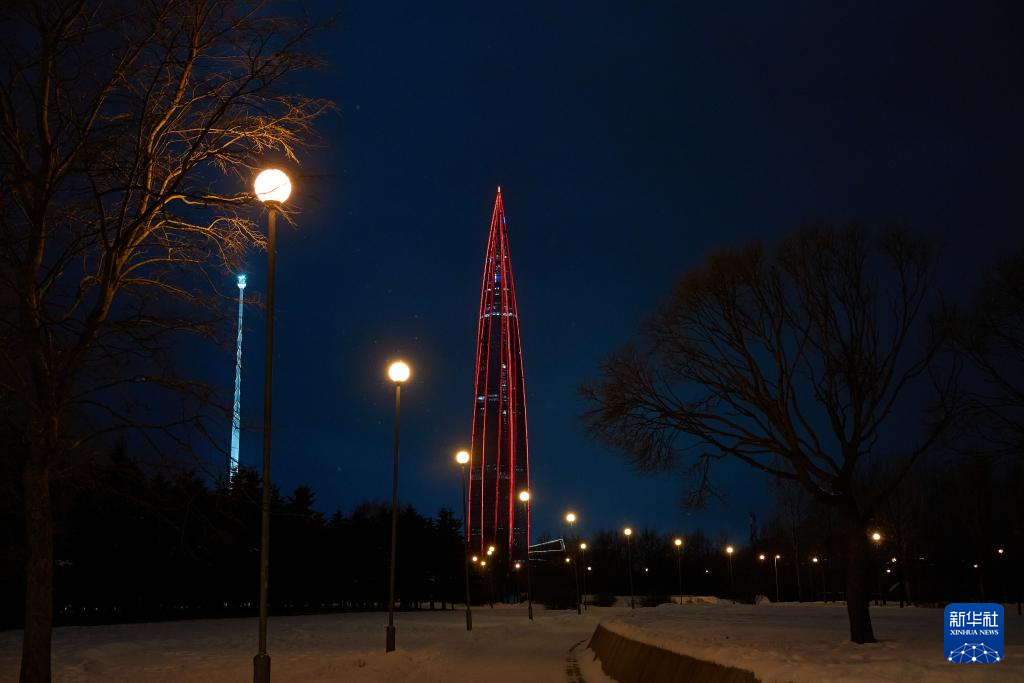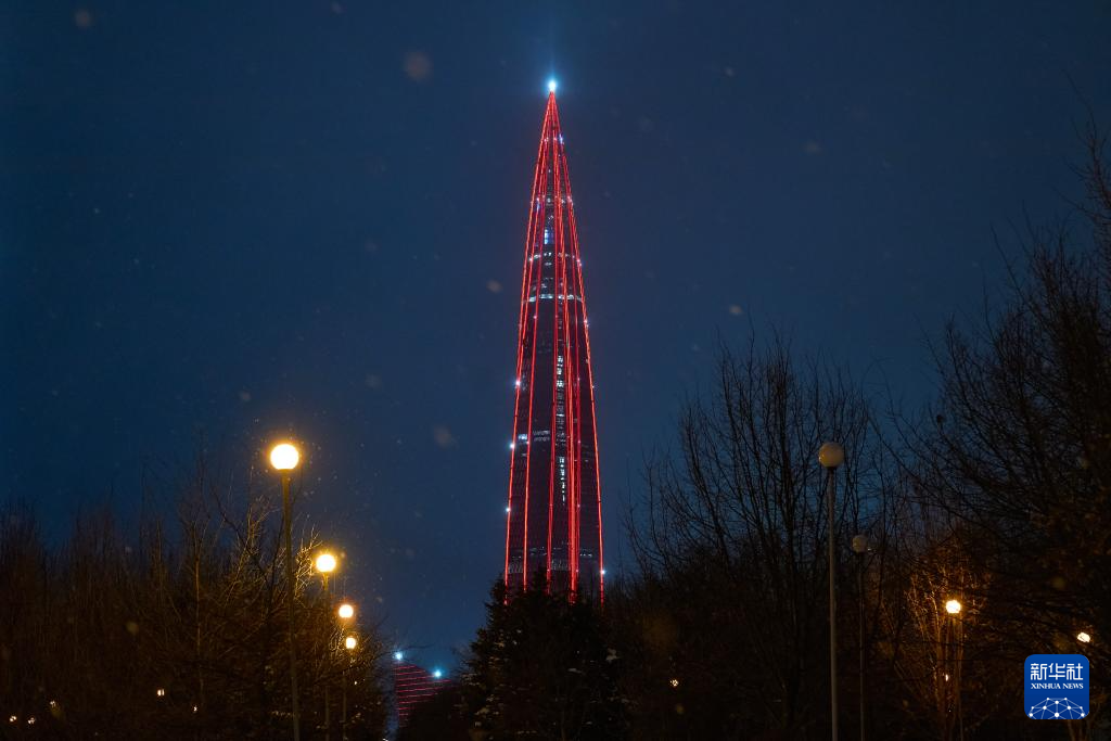 2月15日,在俄罗斯圣彼得堡,拉赫塔中心点亮“中国红”。