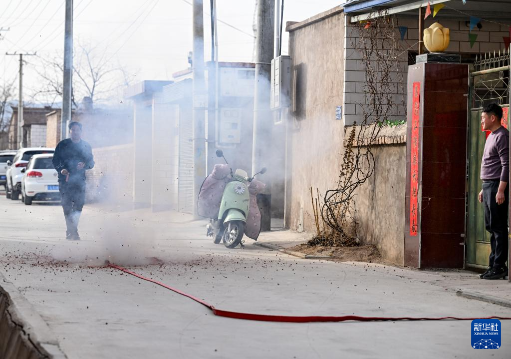 2月16日,吴维东(左)在福宁村的家中和儿子吴昊一起放鞭炮。