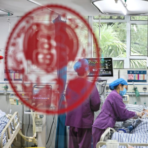 2月16日,在浙江省嘉兴市南湖区,海警医院重症监护室的医护人员为患者治疗。