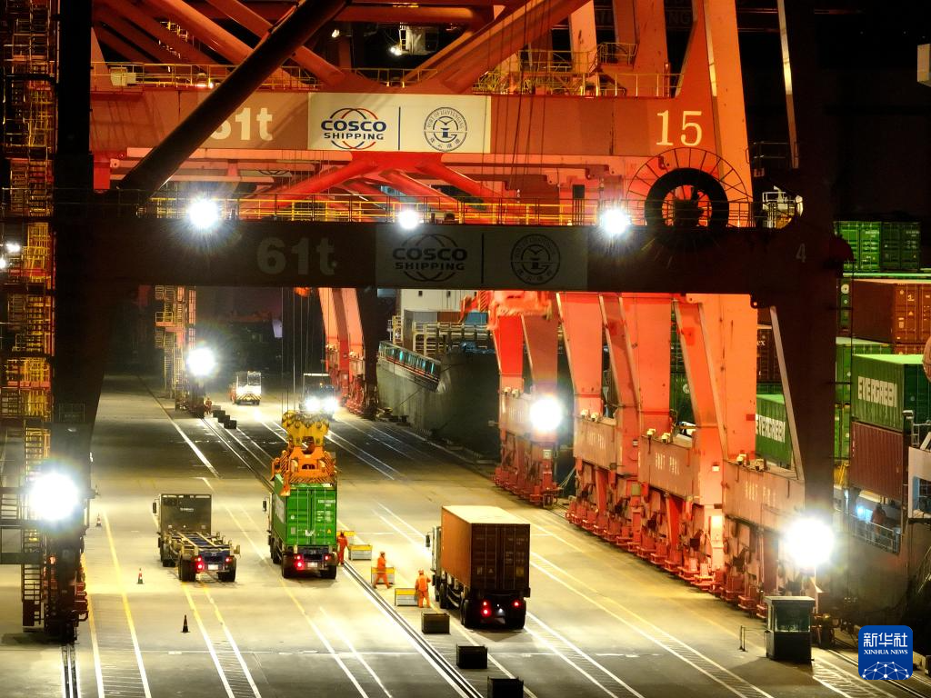2月16日凌晨,江苏省连云港港集装箱码头灯火通明,工作人员在运输、装卸集装箱(无人机照片)。