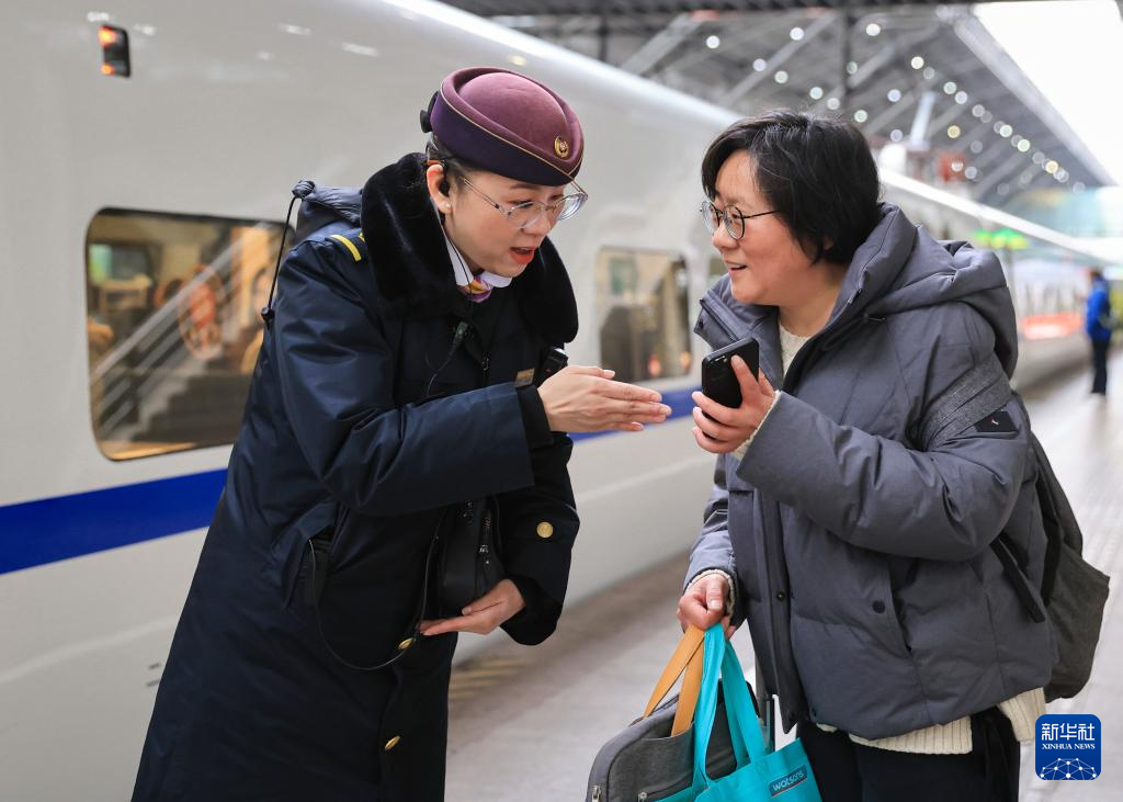 2月16日,在南京火车站,乘务人员在站台上解答旅客问询。