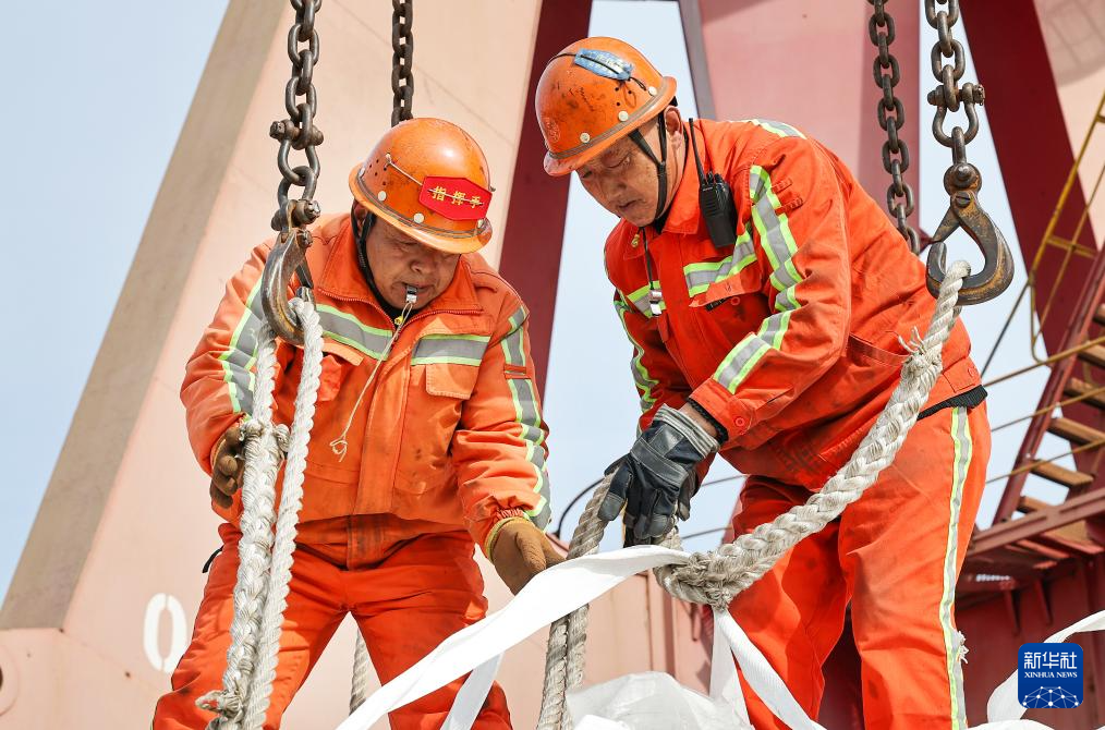 2月16日,在江苏连云港港东方港务分公司码头,港口工人为出口货物挂钩,准备吊装。