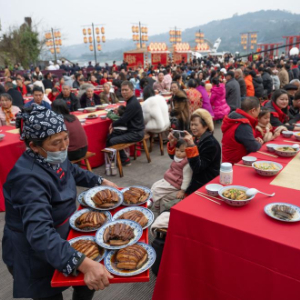 2月16日,在重庆永川松溉古镇,人们在一场千家宴活动现场体验中国年味。