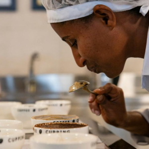 2月13日,在埃塞俄比亚首都亚的斯亚贝巴的一家咖啡加工厂,工作人员在品鉴咖啡。