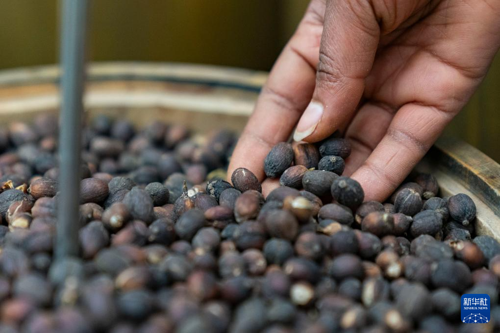 2月13日,在埃塞俄比亚首都亚的斯亚贝巴的一家咖啡加工厂,员工在操作咖啡烘焙机。