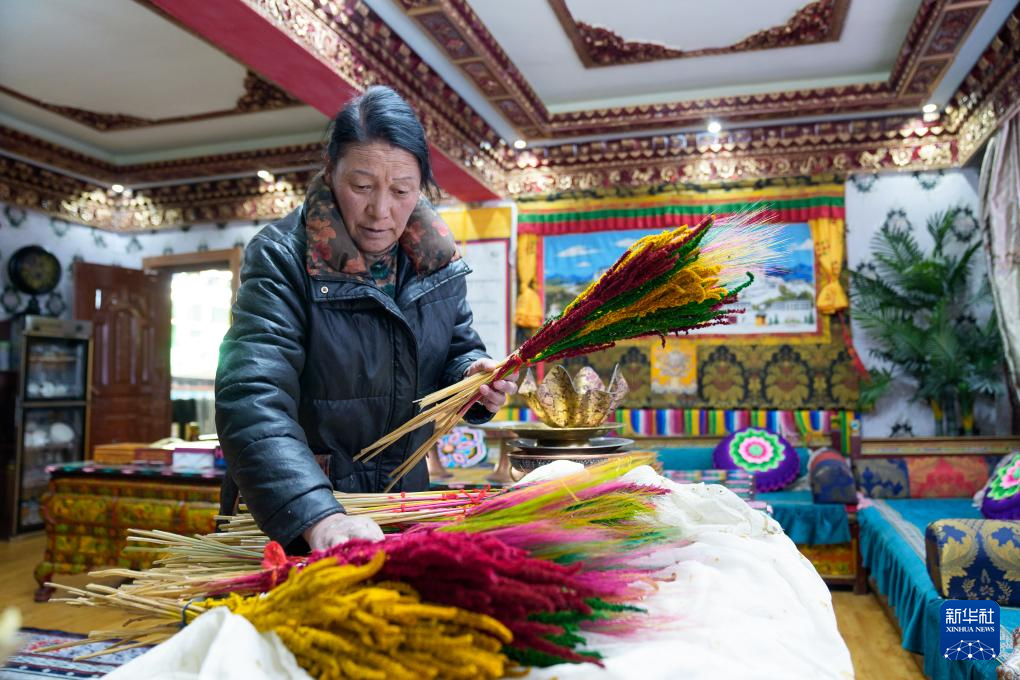 2月16日,在拉萨堆龙德庆区东嘎街道桑木社区,群群的妻子扎桑在整理“罗萨美朵”。