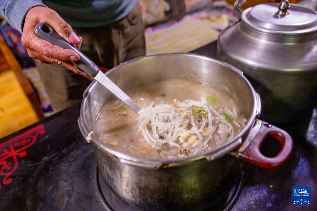 2月16日,在拉萨堆龙德庆区东嘎街道桑木社区,群群的妻子扎桑(左)在为家人盛“古突”。