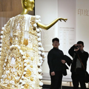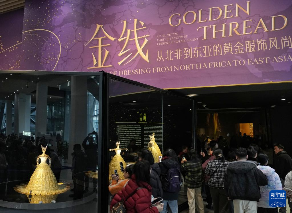 2月17日,观众在成都博物馆参观“金线——从北非到东亚的黄金服饰风尚”特展。