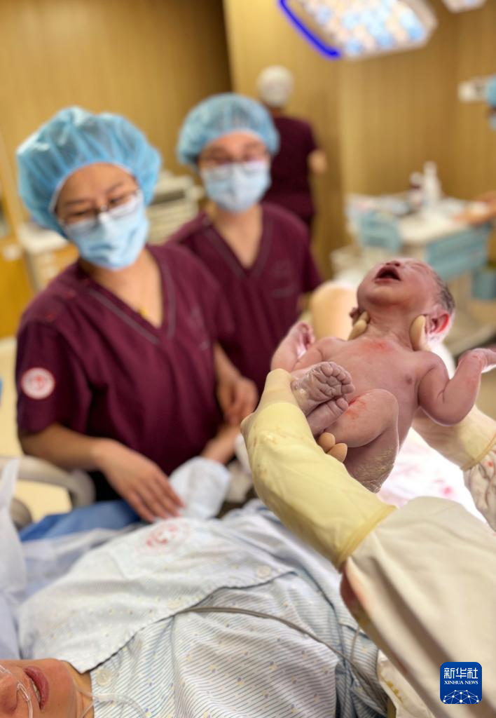 2月17日,在天津市中心妇产科医院,医护人员抱起新生儿给产妇查看。