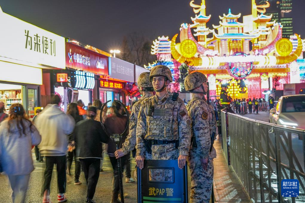 2月15日,武警贵州总队贵阳支队官兵在贵阳观山湖灯会庙市巡逻执勤。