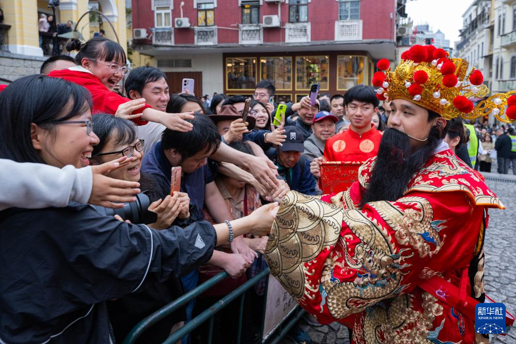 2月17日,“财神爷”在澳门大三巴牌坊前与市民互动。